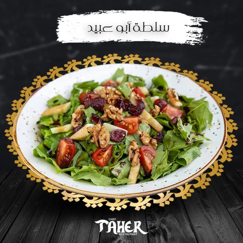 تشكيلة من الخضار الطازجة المتبلة بزيت الزيتون والسماق وخل التفاح الطبيعي بالإضاقة الى الليمون ودبس الرمان والخبز المحمص.