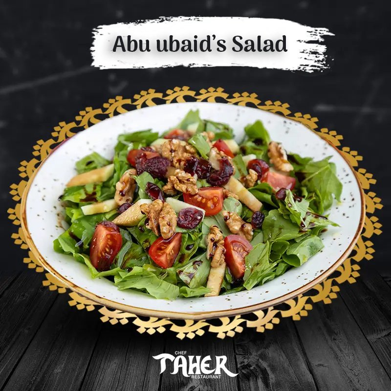 Fresh arugula leaves with the special dressing, walnuts, and dried cranberries.